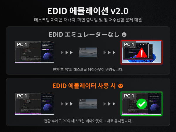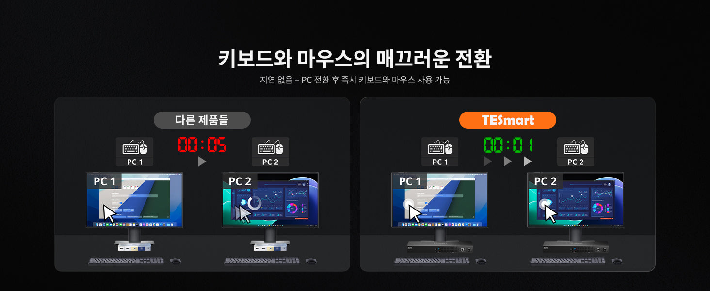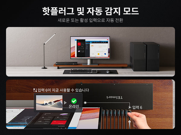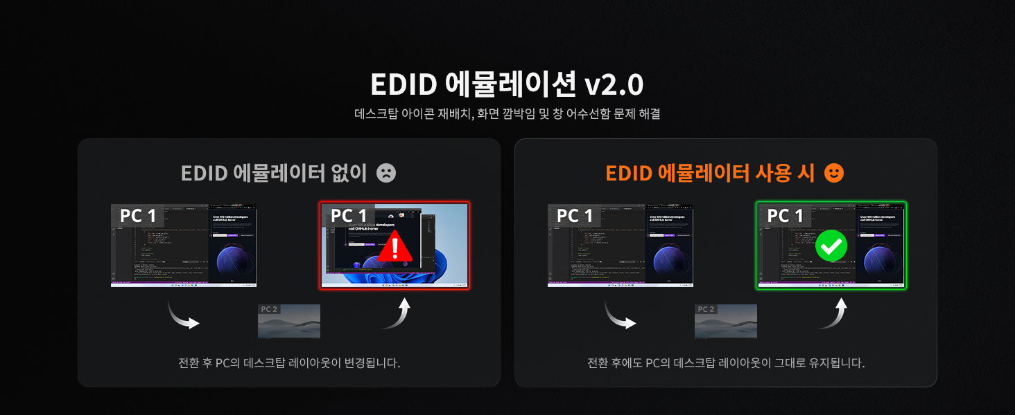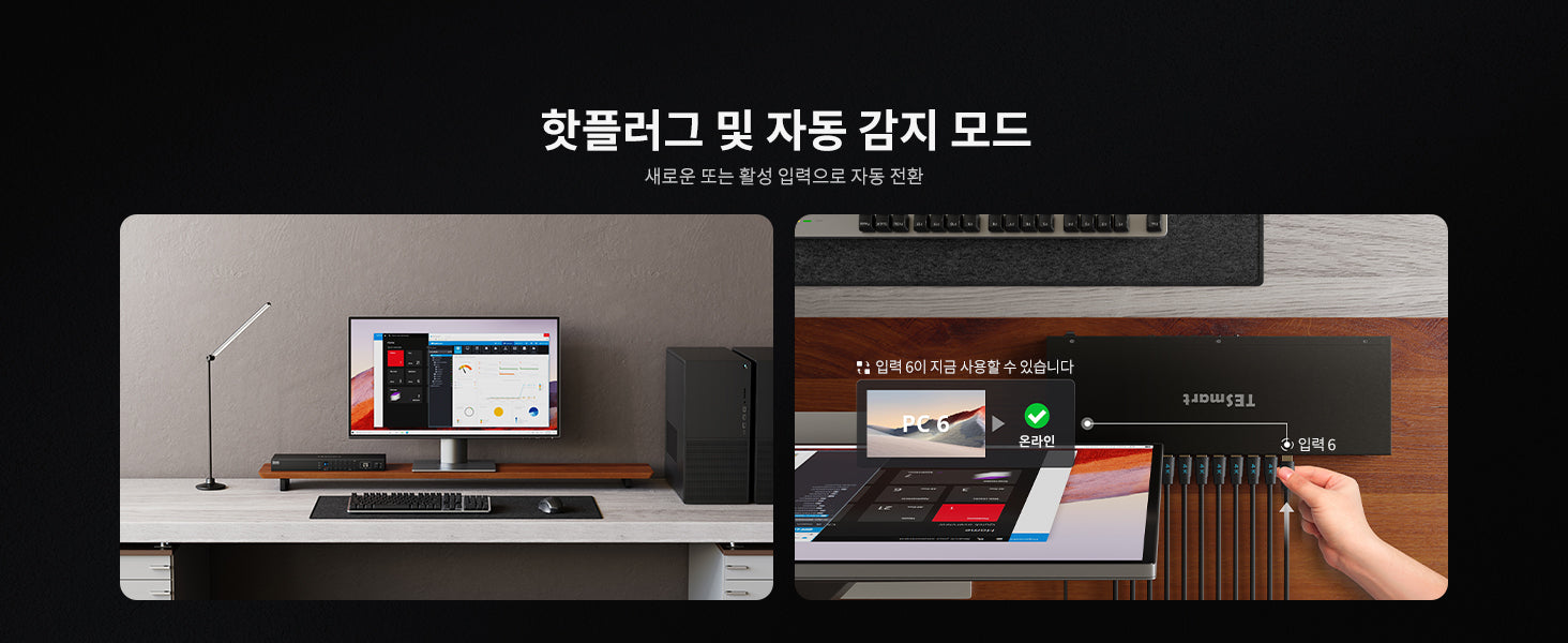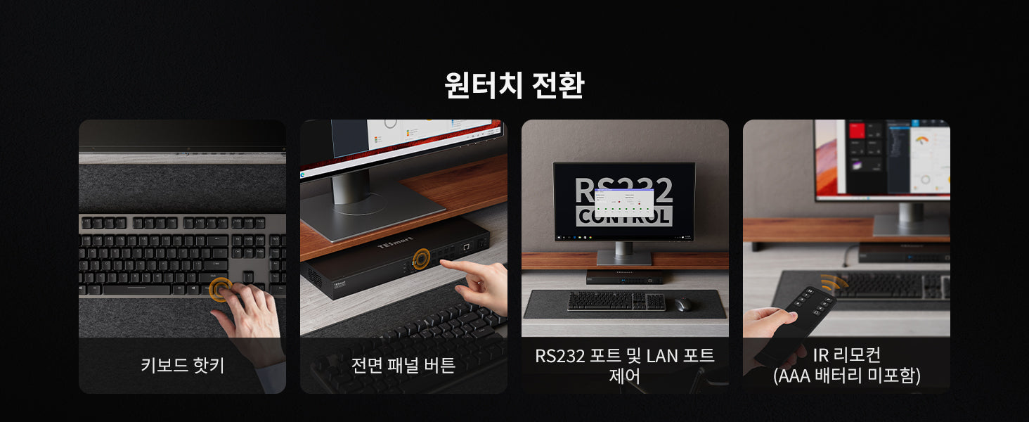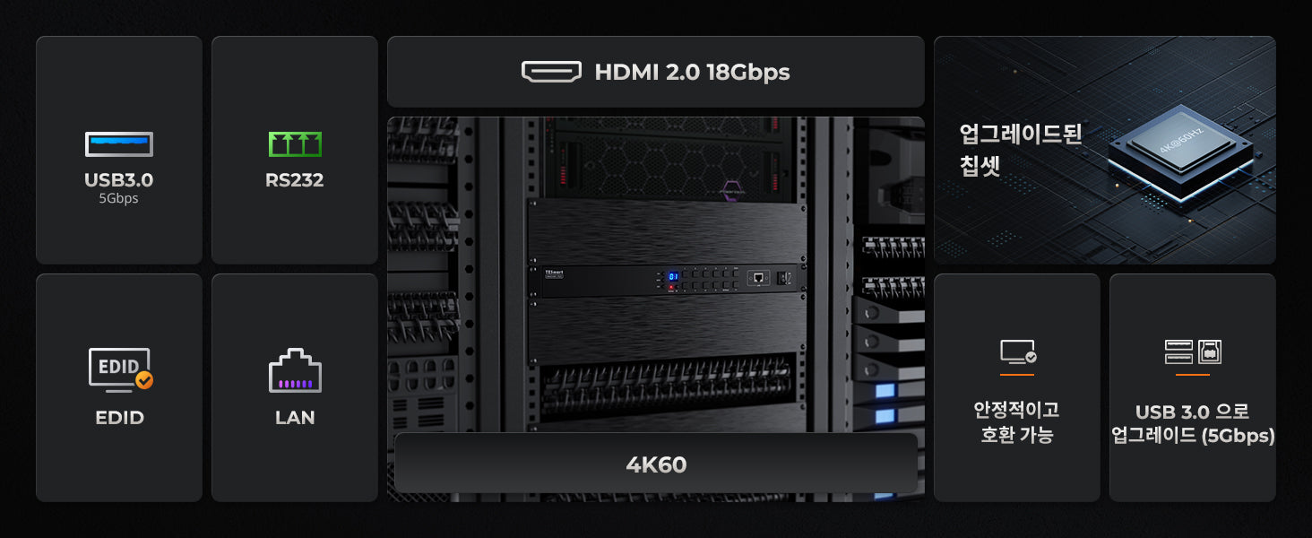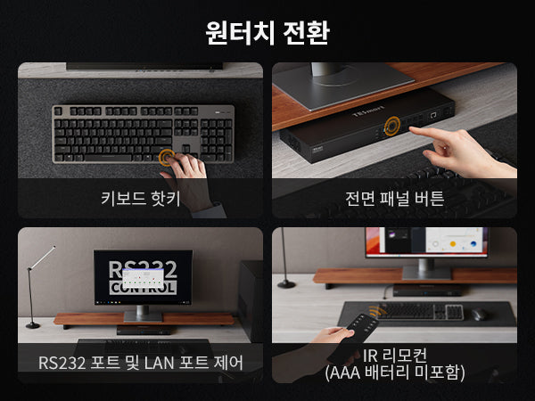 3840x2160@60Hz 해상도 지원, USB 3.0 호환성, 다양한 운영 체제 지원, 핫 플러그 기능, IR, 키보드 핫키 또는 RS232를 통한 쉬운 전환 지원.