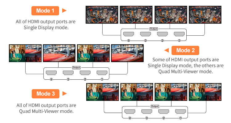 - 각 HDMI 출력은 쿼드 멀티뷰어 모드를 지원합니다.