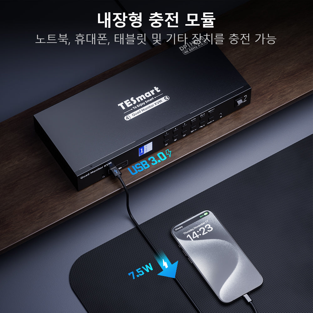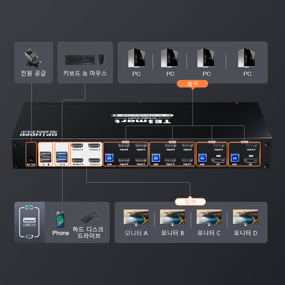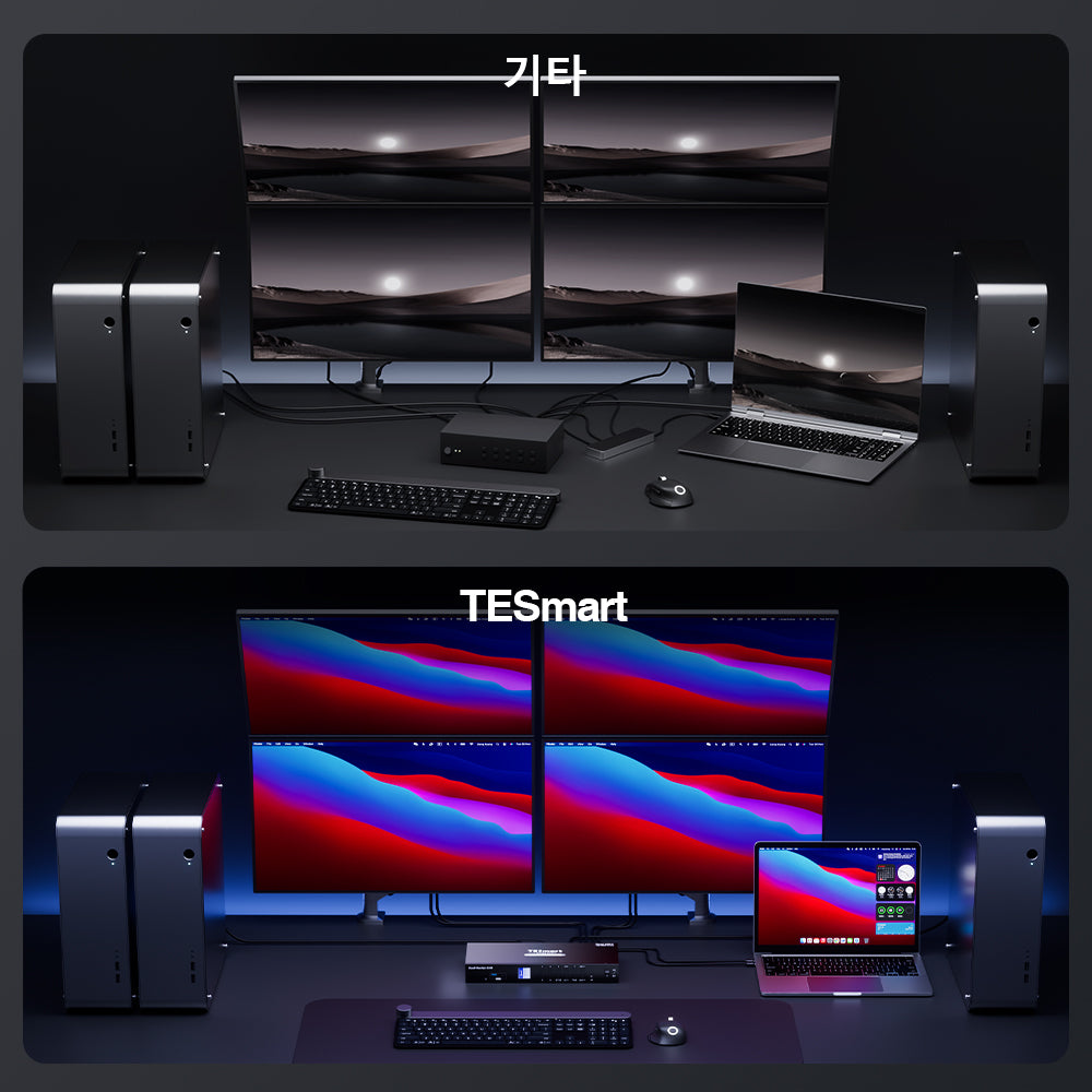 TESmart 쿼드 디스플레이 KVM 스위치를 사용하면 단일 키를 사용하여 4대의 PC 간을 쉽게 전환할 수 있습니다. MST 기술을 사용하여 확장되거나 미러링된 매끄러운 쿼드 스크린 디스플레이를 제공합니다. 이는 스크린 스플라이싱 및 매트릭스와 같은 사용을 제공하여 홈 오피스 멀티미디어 워크스테이션을 관리하는 데 완벽합니다. 워크스테이션과 게임용 PC 모두에 이상적인 솔루션입니다.