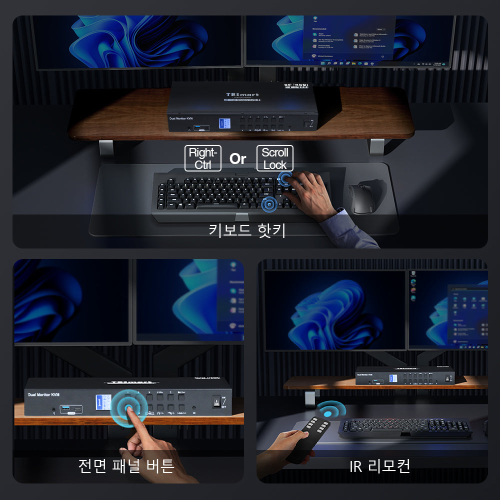 - 편리한 K&M 전환 방식:핫키(단축키), 전면 패널 버튼, IR 리모컨 등 다양한 방법을 통한 간편하고 원활한 키보드 및 마우스 조작을 지원합니다.