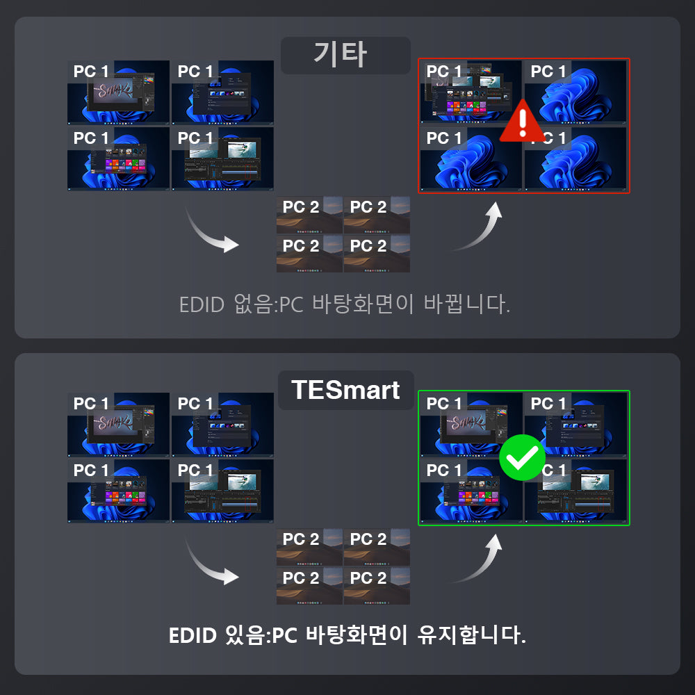 TESmart KVM 스위치는 각 입력 포트에 EDID 에뮬레이터가 있어 PC에 항상 올바른 디스플레이 정보가 제공됩니다. 이를 통해 해상도 변경 및 아이콘 재배열을 방지하여 일관되고 최적의 시청 경험을 제공합니다.