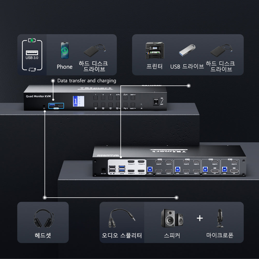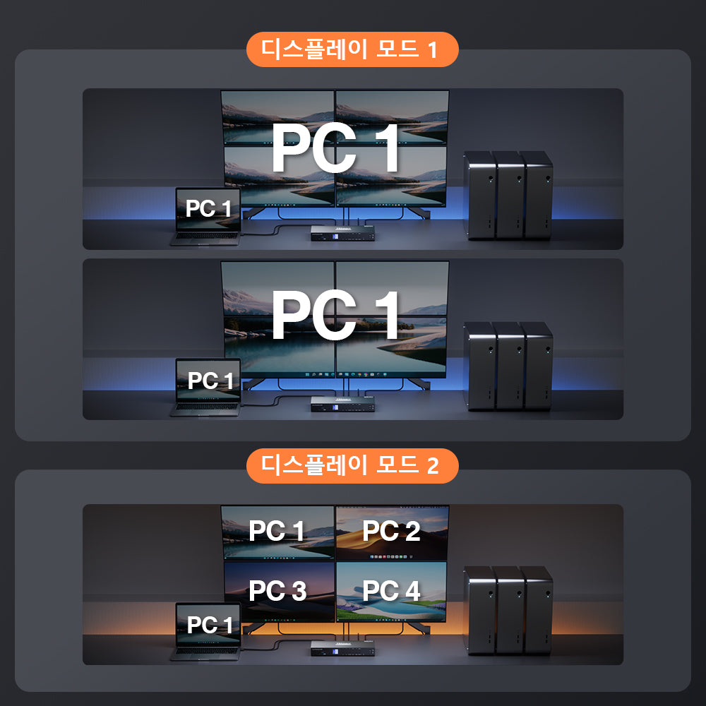 - 업그레이드된 쿼드 디스플레이 디자인: 최대 4개의 모니터와 4개의 PC와 호환됩니다. 부피가 큰 케이블 연결을 줄이면서 4개의 디스플레이에서 멀티태스킹을 위해 최대 3840x2160의 해상도를 제공합니다.