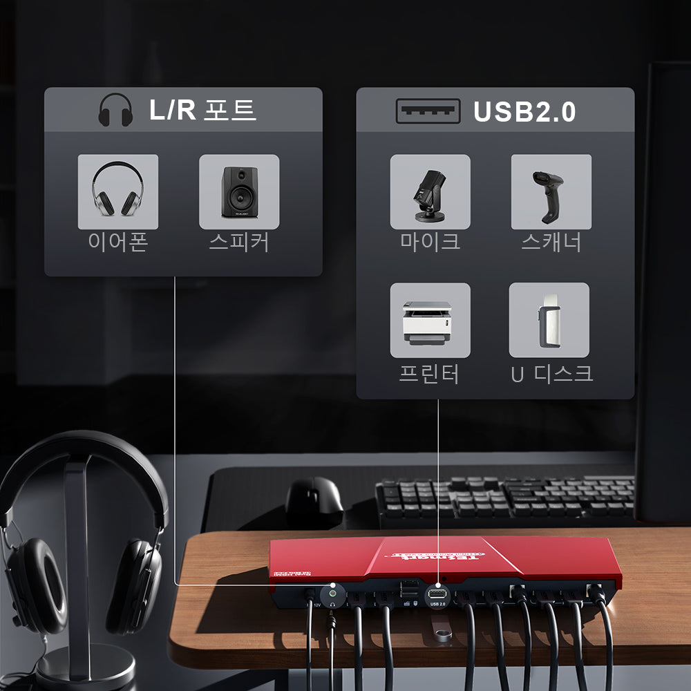 L/R 오디오 출력 포트를 통해 헤드폰이나 스피커를 쉽게 연결하고 원활한 오디오 출력을 즐기십시오.여러 장치 간에 USB 2.0 장치를 공유하여 설정을 단순화하고 생산성을 높입니다.집, 사무실 또는 교육 환경에 적합합니다
