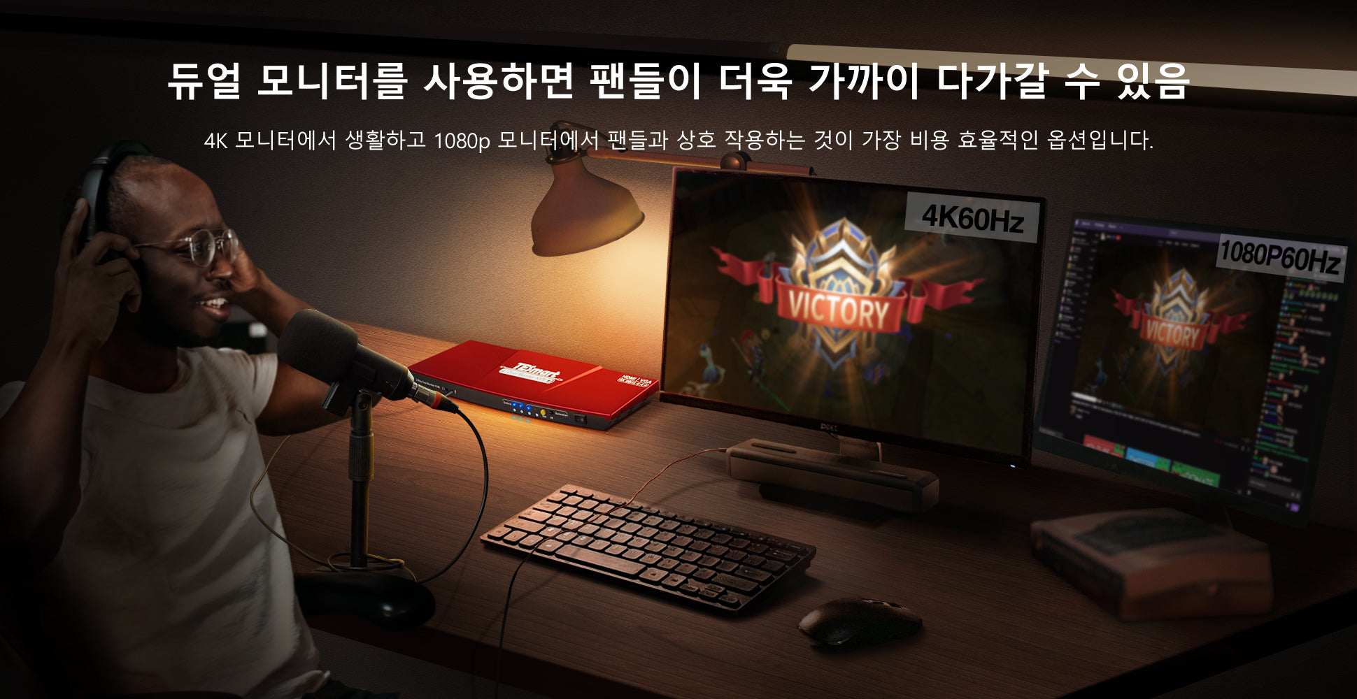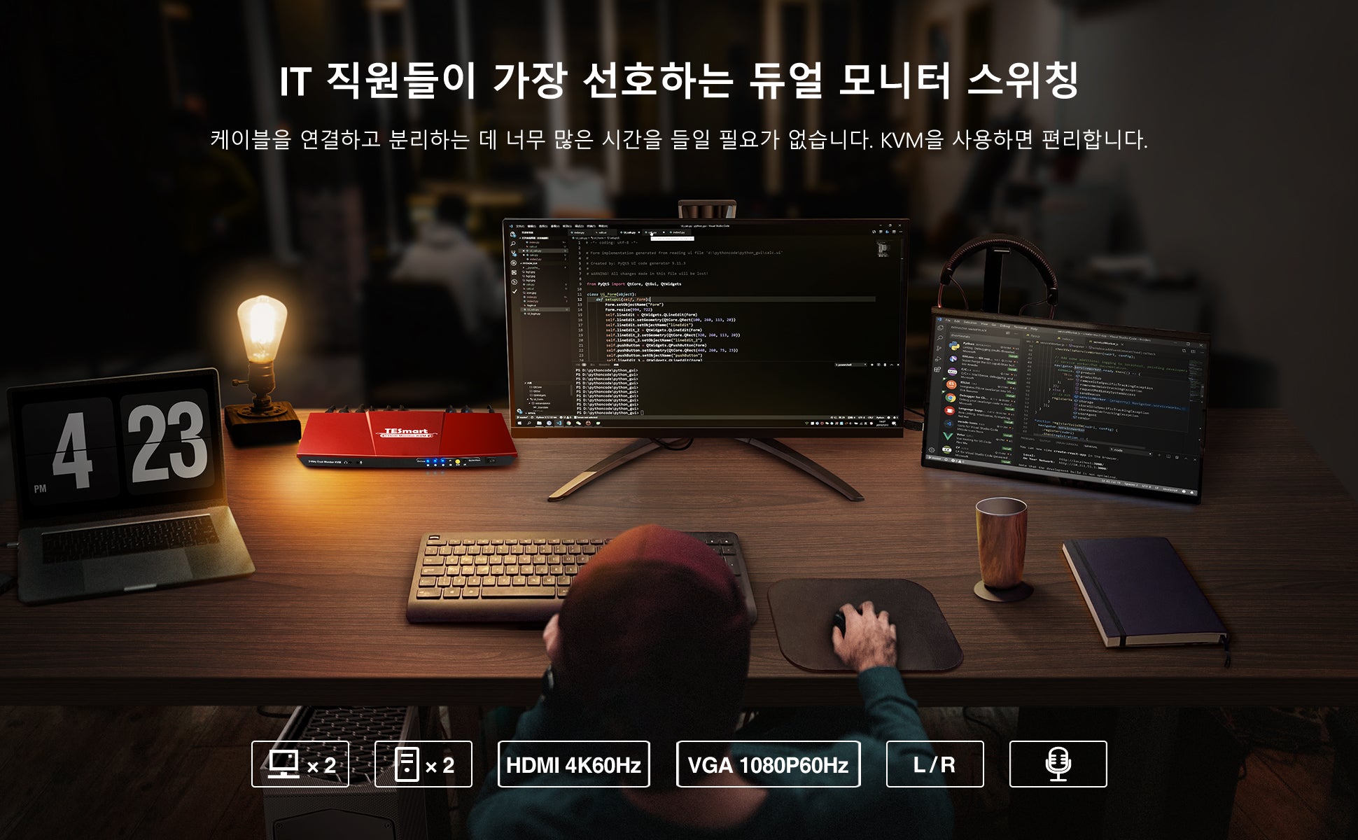 이 2포트 듀얼 모니터 KVM은 크로스 플랫폼 컴퓨터 장비를 쉽게 통합할 수 있는 뛰어난 유연성을 제공합니다. 한 대의 PC의 HDMI와 VGA를 두 대의 HDMI 모니터에 동시에 출력할 수 있습니다. 또한 전면 패널 버튼, IR 리모컨 및 키보드 단축키로 듀얼 모니터 KVM을 제어할 수 있습니다.