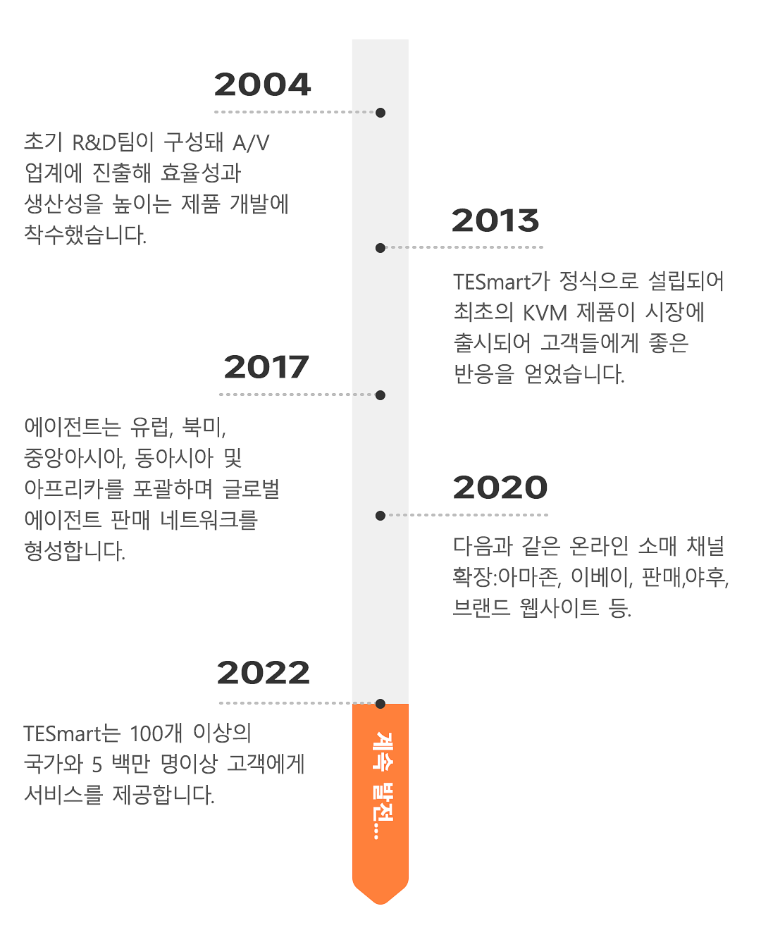 2013년 창립 이래 TESmart는 고품질의 글로벌 칩셋을 활용한 제품 제조를 통해 세계적인 수준의 KVM 스위치 제품을 고객에게 제공하는 온라인 브랜드로 자리매김했습니다.