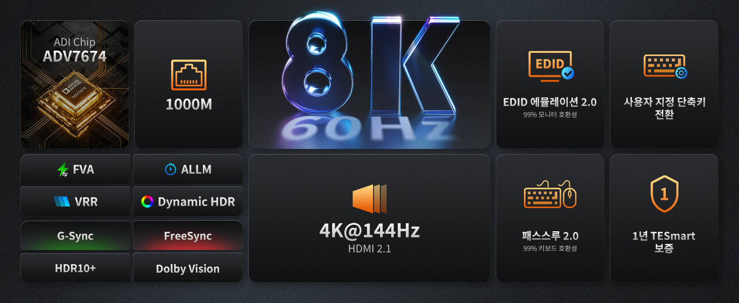 TESmart의 선구적인 EDID 에뮬레이션 기술로 향상된 USB-C가 포함된 진정한 8K60Hz 비전입니다.