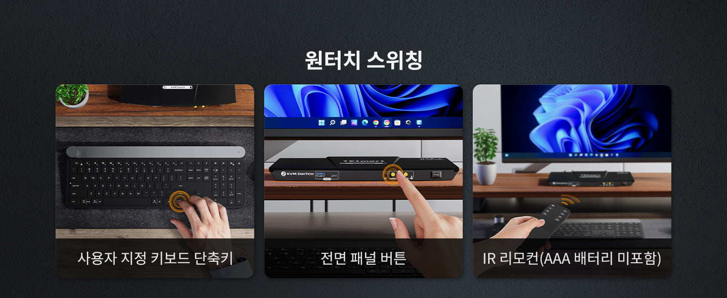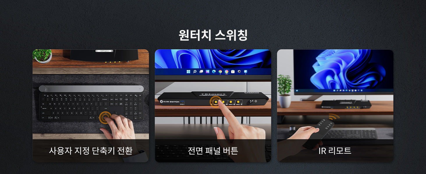 • 입력을 전환하는 4가지 방법: 키보드 핫키, 마우스 휠, 전면 패널 버튼 또는 IR 신호, 전환 후 원활한 키보드 및 마우스 작동.