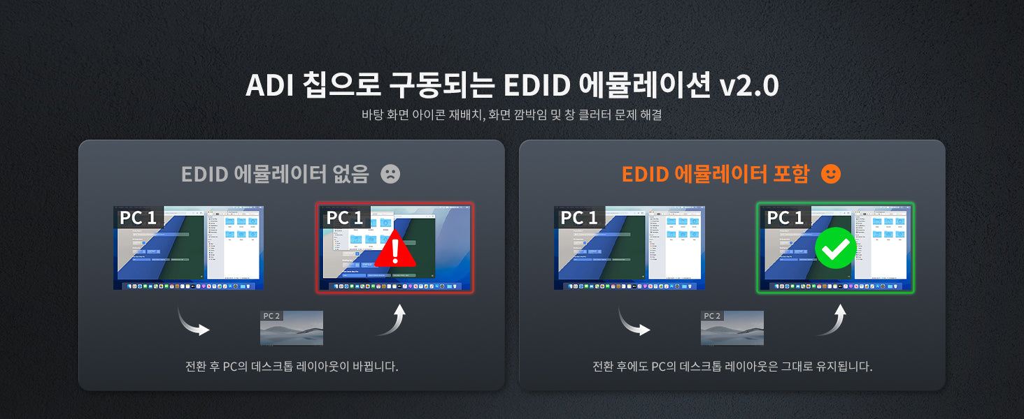 • EDID 에뮬레이션은 해상도 및 아이콘 재배치를 방지합니다.